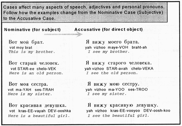 | The Accusative Case is used to designate the Direct Object of the sentence. This is usually a person or object being acted upon, or, as the name suggests, the person being "accused." In the sentence: John saw Mary, the direct object is "Mary." English uses word order to designate the direct object, Russian (Latin, German and other inflected languages) use a "tag" or a marker to indicate this. | ||||||||||||||||||||||||||||||||||||||||||||||||